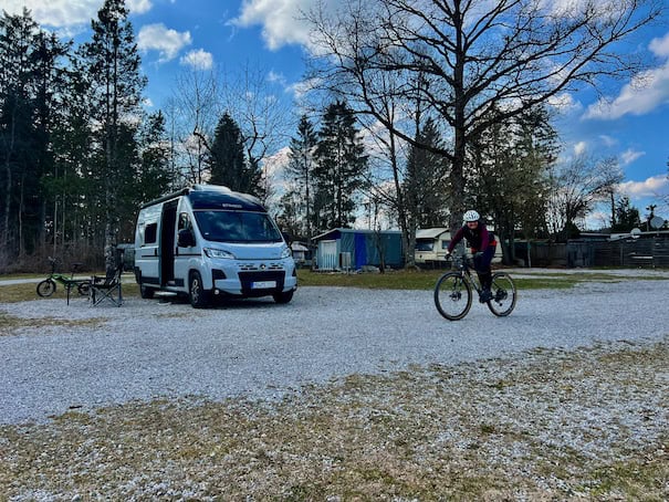 Später zauberte ich für Christof Nudeln mit Pesto, was richtig lecker war… dafür durfte Christof das Geschirr spülen. Am Montag war ich im Homeoffice und saß die meiste Zeit vor dem Rechner. Über die Mittagszeit radelten wir für ein paar Besorgungen fix nach Geretsried, was zwischendrin richtig gut tat. Da sich die Temperaturen noch immer nicht im zweistelligen Bereich bewegten, machten wir es uns zum Abend hin im Auto gemütlich und genossen den vorerst letzten Abend im Strawanzer. Am Dienstag morgen herrschte schon früh Aufbruchstimmung, denn es war für halb zwölf ein Meeting angesetzt, an dem ich von zuhause aus teilnehmen wollte. Fix war alles zusammengeräumt und so starteten wir pünktlich um 9 Uhr, nachdem wir bezahlt haben und waren gegen elf in Notzing und demnach um halb zwölf in Garching.