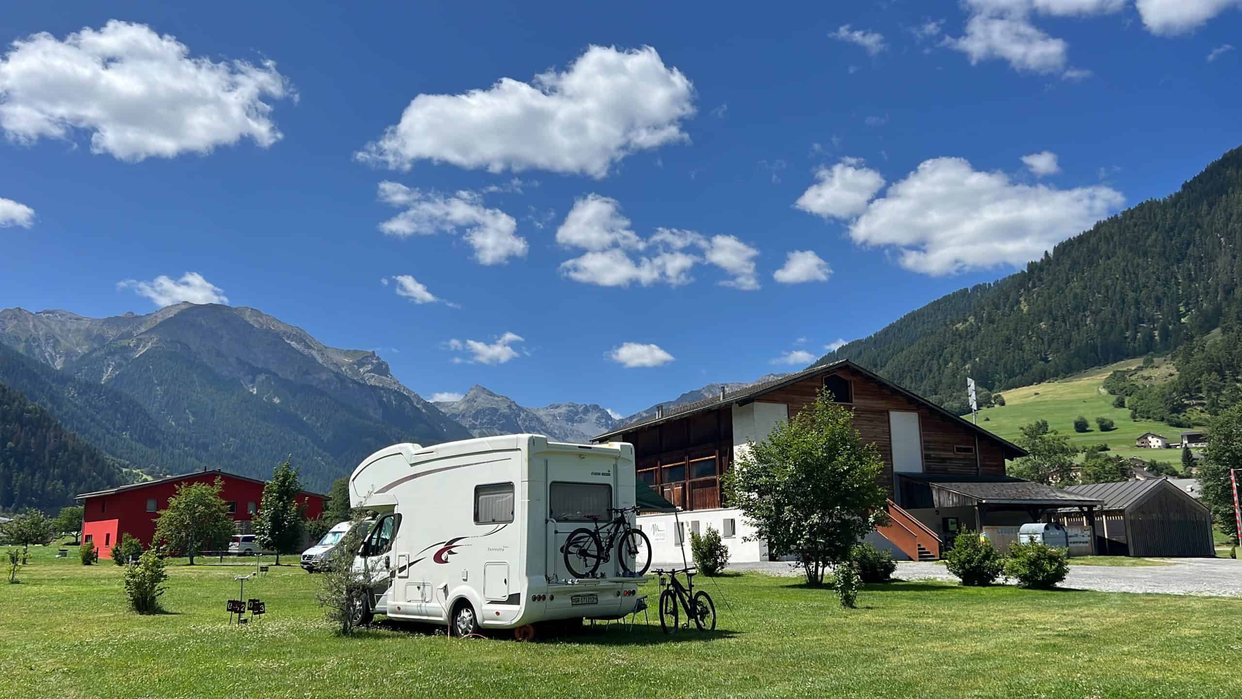 Die Sonne weckte uns bei strahlend blauem Himmel und so zeigte sich der Reschensee, die Bergwelt und die umliegenden Dörfchen von ihren besten Seiten. Fix war alles gepackt und schon ging es los, über Mals und Taufers in die Schweiz ins Val Müstair. Eine Stunde später standen mit unserem Hiasl schon auf der Wiese am Campingplatz und rätselten, welcher Platz für uns wohl der Beste sei.
