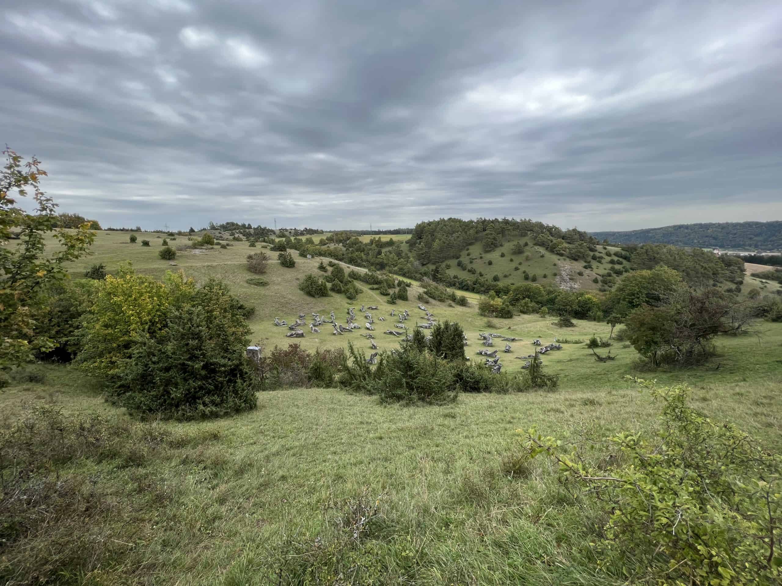 Am Freitag, nachdem wir unseren Hiasl abgeholt hatten (es wurde die Thitronik verbaut) erreichten wir gegen halb sechs, nach einem kurzen Abstecher in Wettstetten um Frischwasser zu fassen den Stellplatz in Eichstätt. Dieser war zu unserem Erstaunen schon recht gut besetzt. Um einen TV-Empfang über unsere Anlage auf dem Dach zu garantieren, wollten wir eigentlich einen Platz auf der linken Seite beziehen, was aufgrund des hohen Andrangs leider nicht möglich war. Wir fuhren einmal bis an das Ende des Platzes, um den dortigen Seitenstreifen auf seine Größe zur prüfen. Dieser war jedoch viel zu schmal, um den Hiasl längst zu stellen, was die Stellplatzordnung vorschreibt. Christof ging einmal zum Lagechecken nochmals zurück und dann passierte mir das, was ich auf jeden Fall vermeiden wollte. Denn ich sperrte mit dem Schlüssel den Hiasl ab und wollte anschließend zur Aufbautür raus … was verheerende Folgen hatte. Zu meinem Entsetzen sprang die Thitronik an und heulte über den kompletten Stellplatz… Herzlichen Glückwunsch, das hast du gut gemacht!!! Super, so wusste jeder am Platz, dass die Zwei mit Münchener Kennzeichen jetzt auch angekommen wären. Mann oh Mann und ich wollte unbedingt nicht die Erste sein, die vor lauter Dusseligkeit einen Fehlalarm unserer neuen Anlage auslöst 🙁 Nachdem ich mir entsprechende Kritik von Christof angehört hatte, parkte ich unseren Hiasl ein und bereitete das Abendessen vor. Das Wetter am nächsten Morgen war wirklich nicht so sehr schön gewesen, so dass wir uns gegen eine Biketour und dafür eine Wanderung zum Figurenfeld entschieden. Wir gingen gegen Mittag los und waren nach einem Abstecher zum Edeka gegen 16 Uhr wieder zurück.