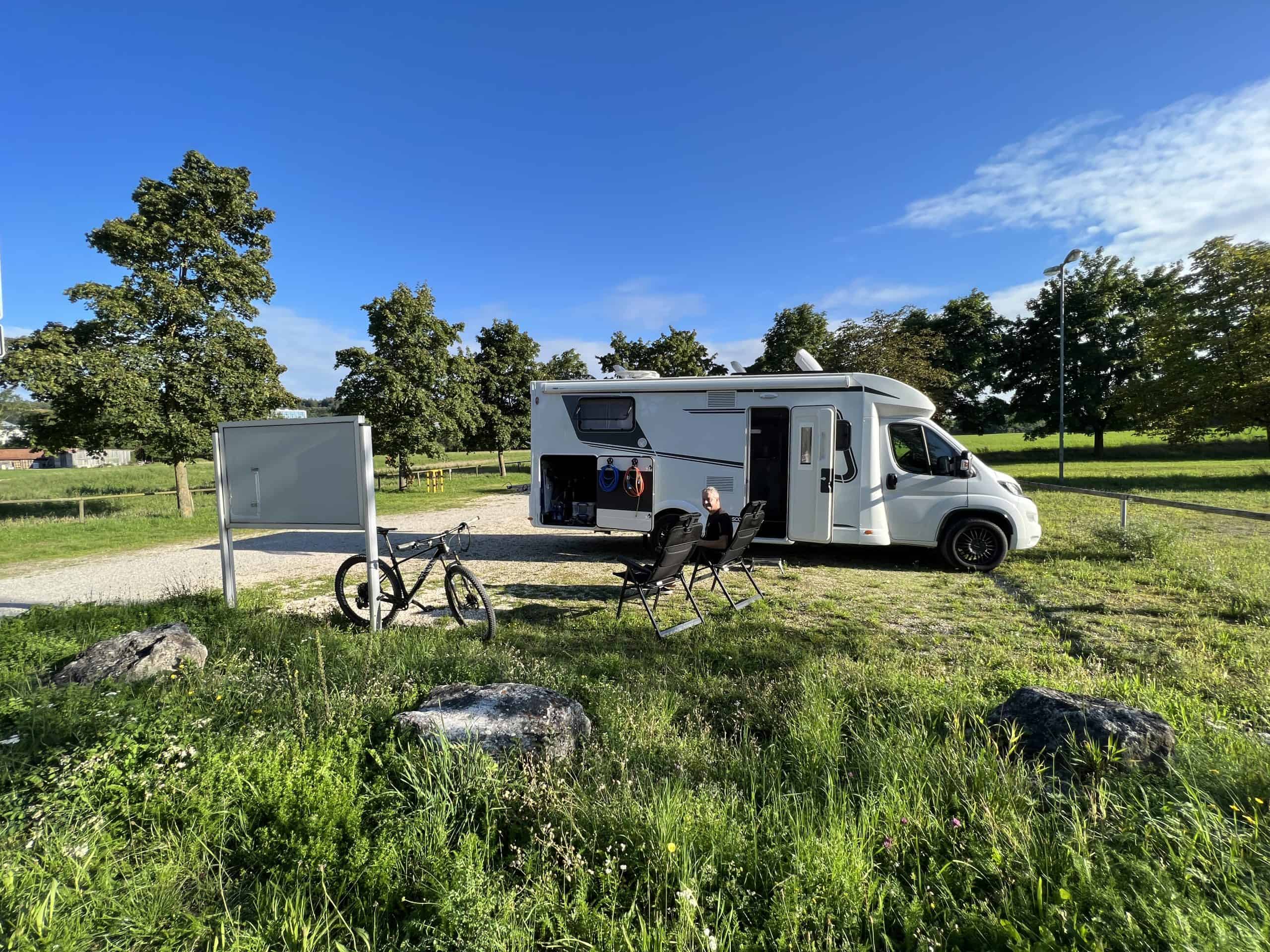 Im Großen und Ganzen ist die Location top, der Platz liegt sehr zentral und ist umringt von Bäumen und Wiesen, die den Platz sehr idyllisch erscheinen lassen. Problem und das ist wirklich unangenehm ist der direkt angrenzende LKW-Parkplatz, über den extrem reger Verkehr läuft und leider auch von LKWs mit Kühlaggregat angefahren wird. Die Kompressoren der Kühlung springen bei sommerlichen Temperaturen, so wie sie zum Zeitpunkt unseres Aufenthalts herrschten, im Zehnminutentakt an und machen leider auch vor der Nachtruhe keinen Halt. Wenn dann auch noch drei von den Dingern am Parkplatz stehen, kann es gut möglich sein, dass der Platz mit einer Dauerbeschallung konfrontiert wird … denn die Kompressoren sprechen sich ja nicht zu einer gemeinsamen Kühlsession ab 😉